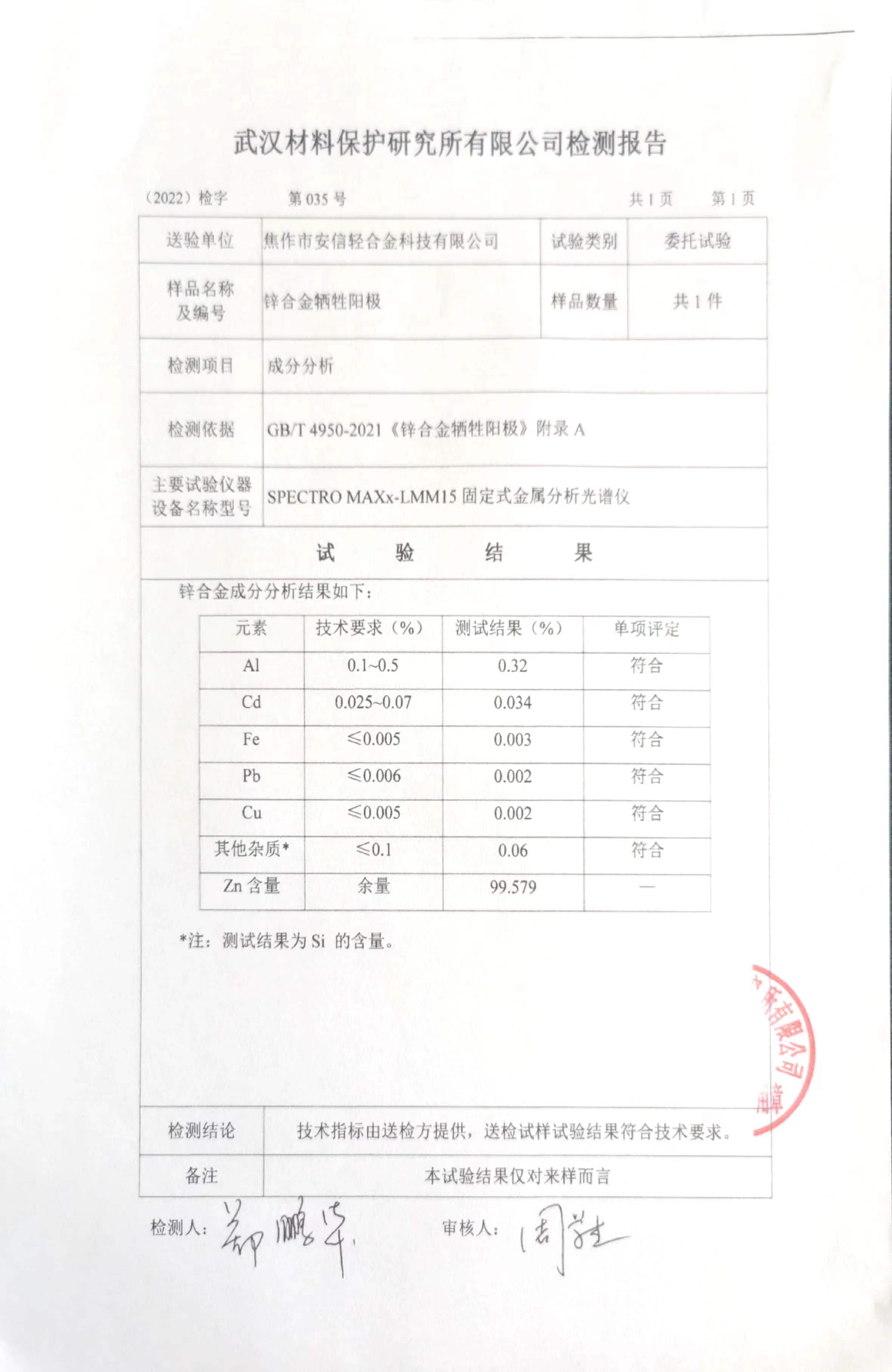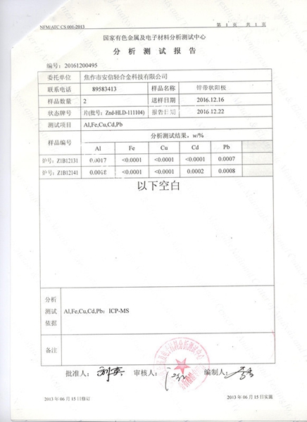 鋅合金犧牲陽極檢驗報告